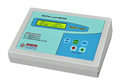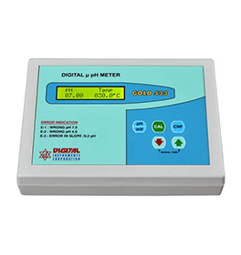 DIC μ pH meter GOLD 533 is a highly precision instrument using latest art of microprocessor technology. It displays three functional readings consfontlyona 16 x 12 LC display screen i.e. Temperature. pH & millivolts on selection. It has the focility for Auto femp.compensation as well as manually using keys. In mvs mode the instrument can be used for redox potential measurement.